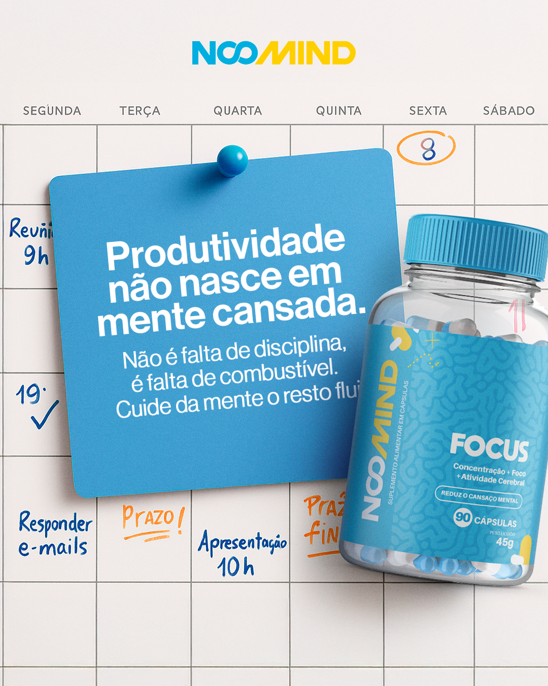 O NOOMIND Focus mantém sua concentração firme por horas, mesmo quando tudo ao redor parece um caos. Ideal pra quem precisa de performance real em estudos, trabalho ou projetos intensos.